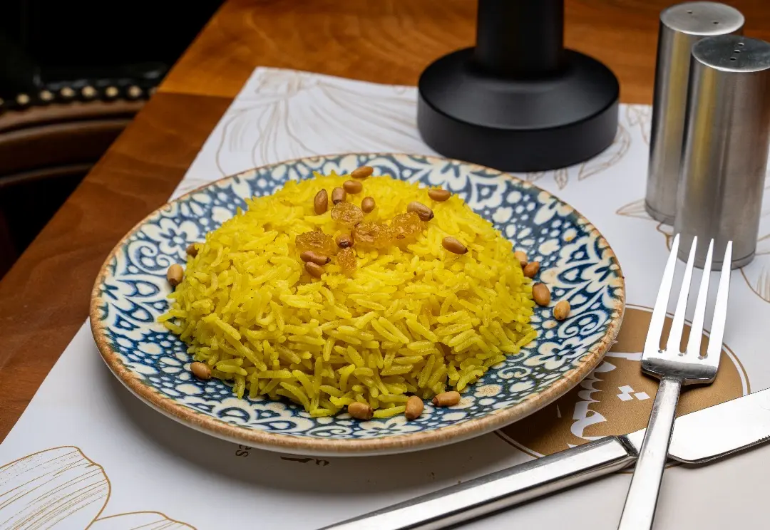 ريش غنم مشوية بتتبيلة شرقية فاخرة ، تقدم علي فراش من الآرز آلمبهر ،