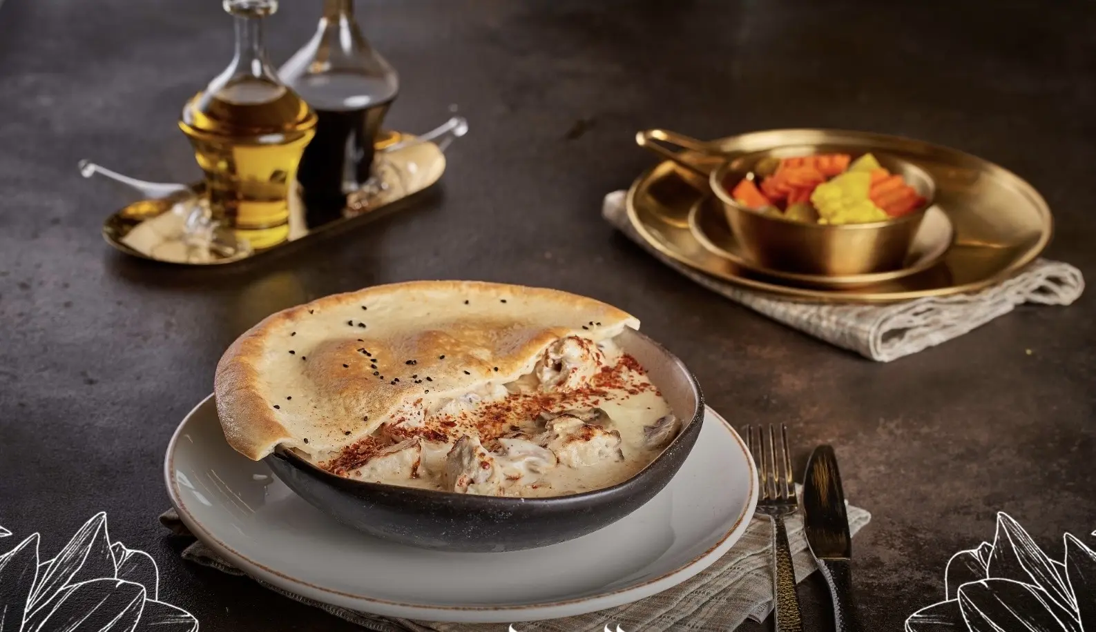 صلصة الزبادي الكريمية المتبلة بالثوم والطحينة، ومغطاة بقطع من لحم الضأن الريفي.