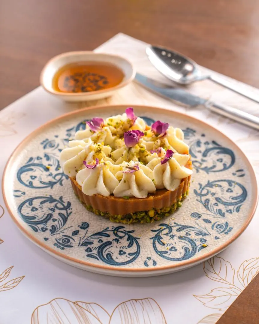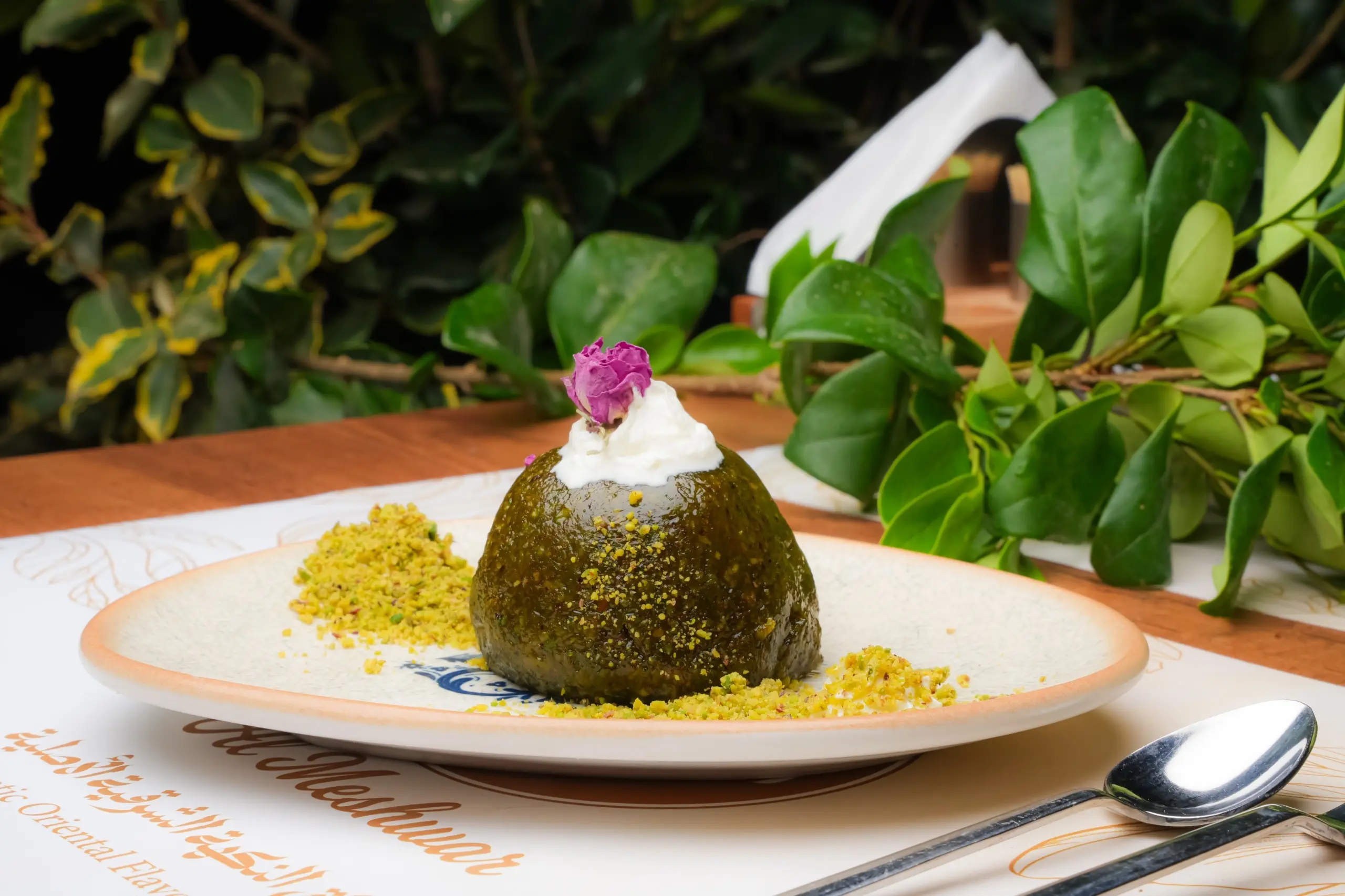 تحلية لبنانية ناعمة بقوام مخملي، تُحضّر من الحليب الطازج ثم تُزيَّن بالفستق الحلبي المفروم