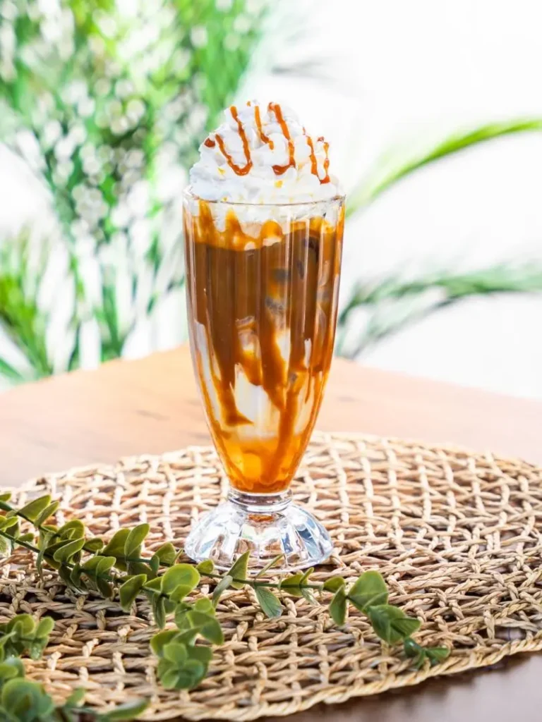 Smooth and creamy iced coffee with rich caramel twist, for a sweet refreshing treat